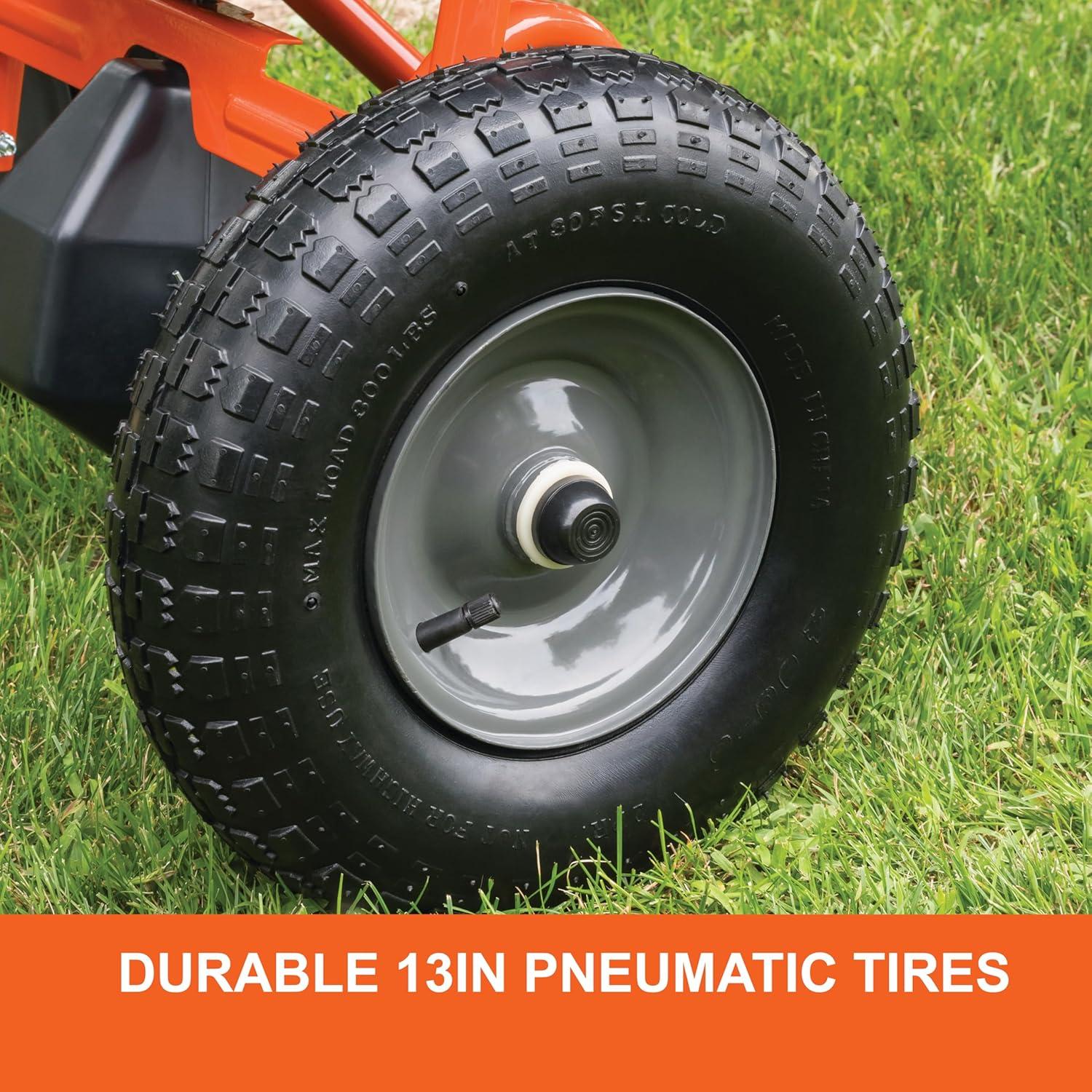 Pneumatic tires allow for increased maneuverability and easier to push in your lawn